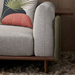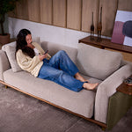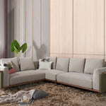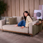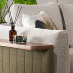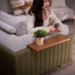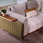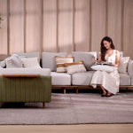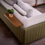 Celadon, a modular fabric sofa that embraces your body wherever you sit, suiting your lounging needs. It is well-equipped with a slim side table designed to slot flawlessly into the side or back padding of the sofa. Celadon features a clean, contemporary style that sits on a steel laminated metal base with natural American walnut veneer and gold-tipped legs, revealing its subtle vintage vibes.