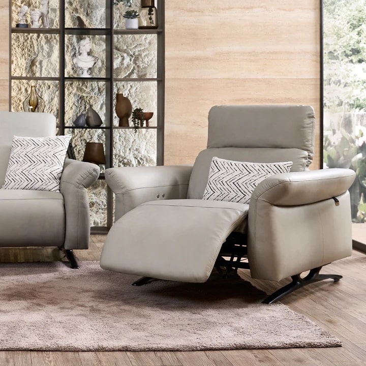 Fabric recliners offer a softer, cosier feel with more colour options, while leather recliners provide a sleek, timeless aesthetic that is easier to wipe clean. Both are durable and designed to complement modern living rooms.