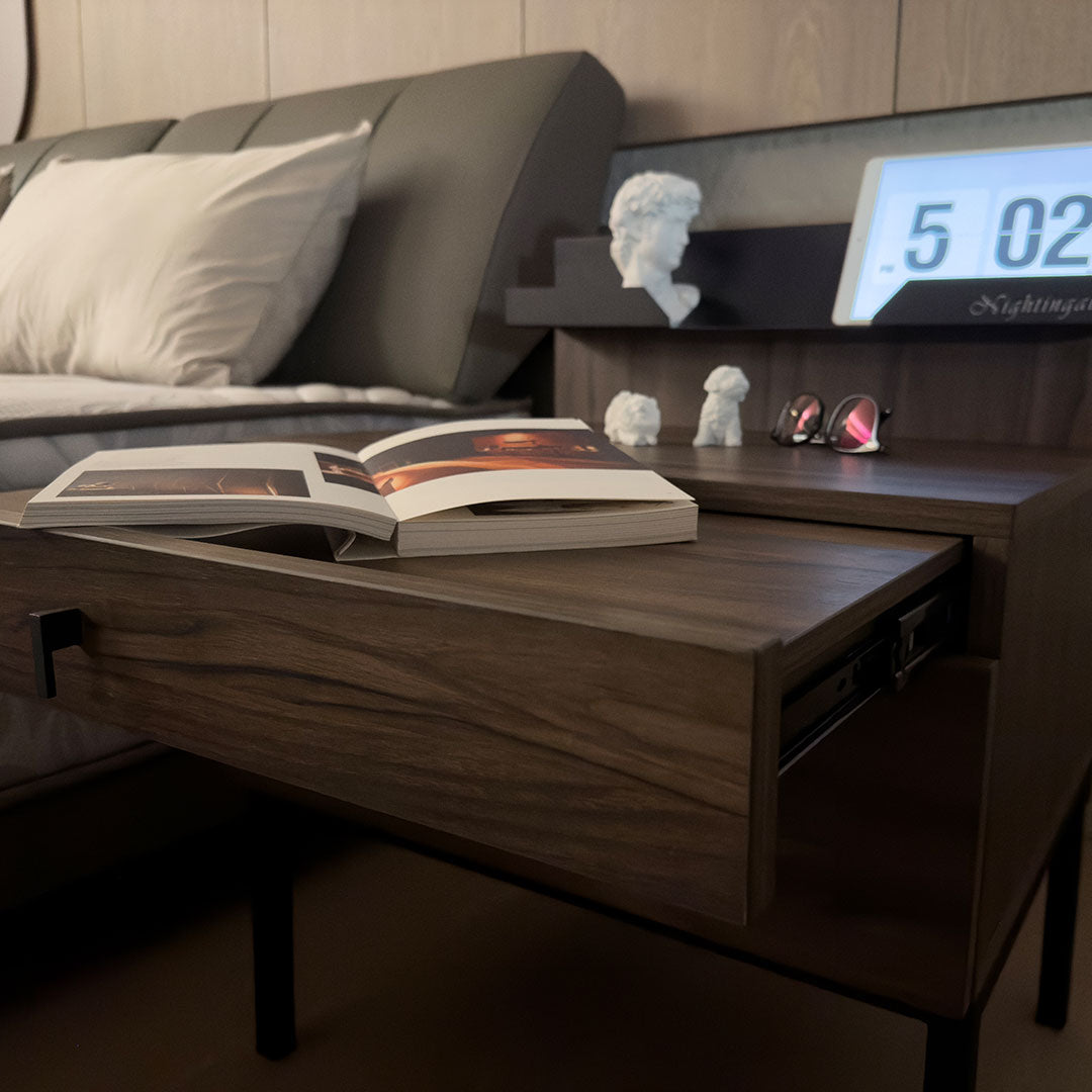 Yes, if you are looking for integrated charging ports, the Dansk Bedside Table (with charging ports might be terminated, doubled check) is an ideal choice. It functions as a wireless charging station for your phone, making it convenient to access from your bed or sofa. For cable management features, the Slide Bedside Table has hidden storage and a grommet hole to place an extension wire, allowing you to plug in lamps, radios, or mobile devices without visible wires.