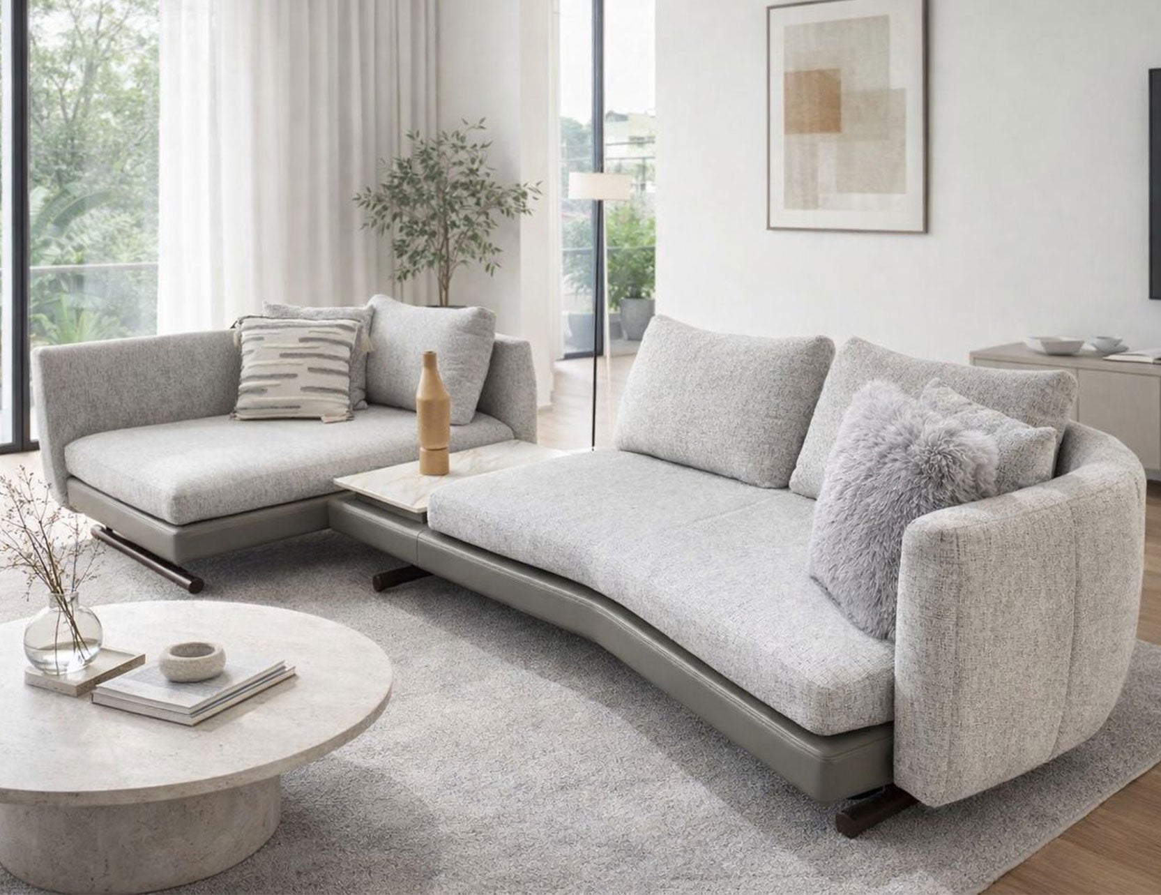 What makes JANUS truly stand out is its rounded backrest design, which not only looks trendy but also extends the seating area on select modules. Modules C/D come with an integrated sintered stone surface, a sleek and scratch-resistant built-in side table for drinks, snacks, or décor.