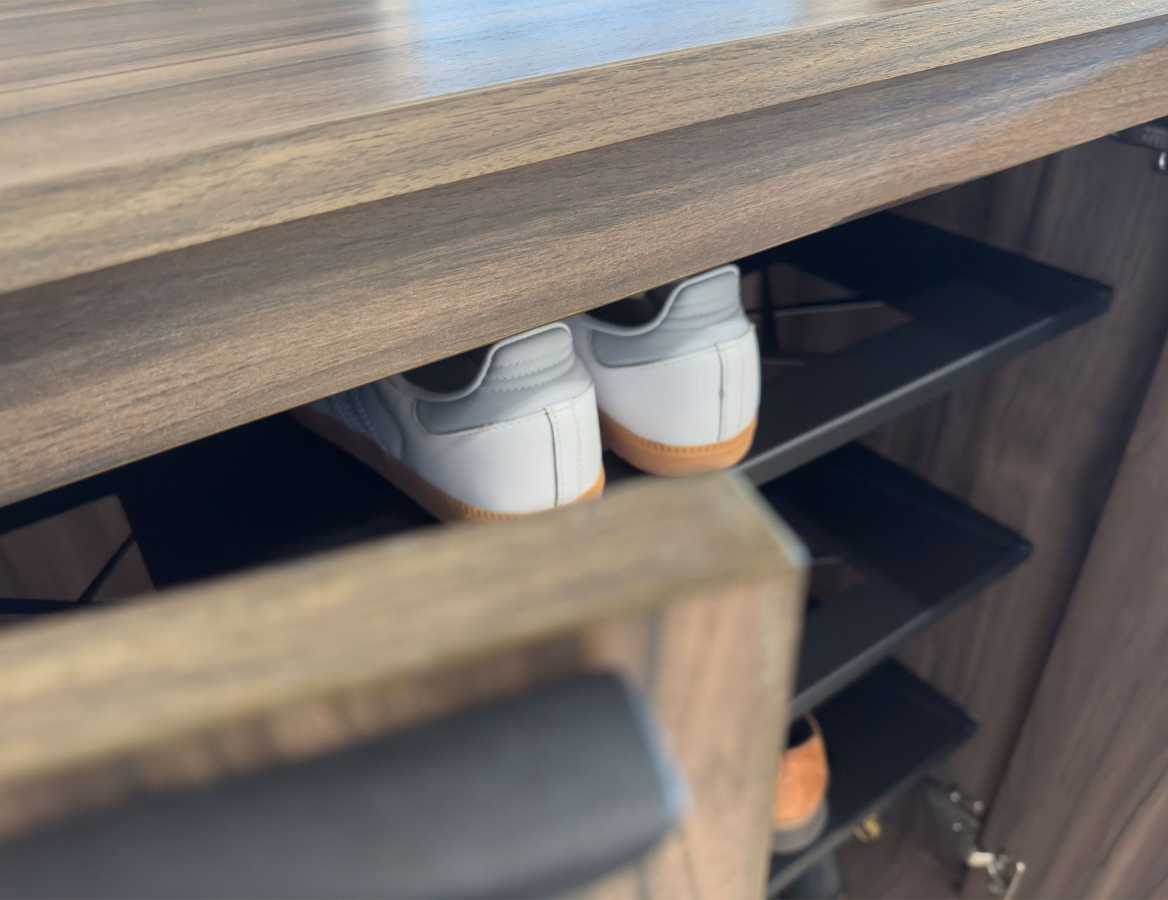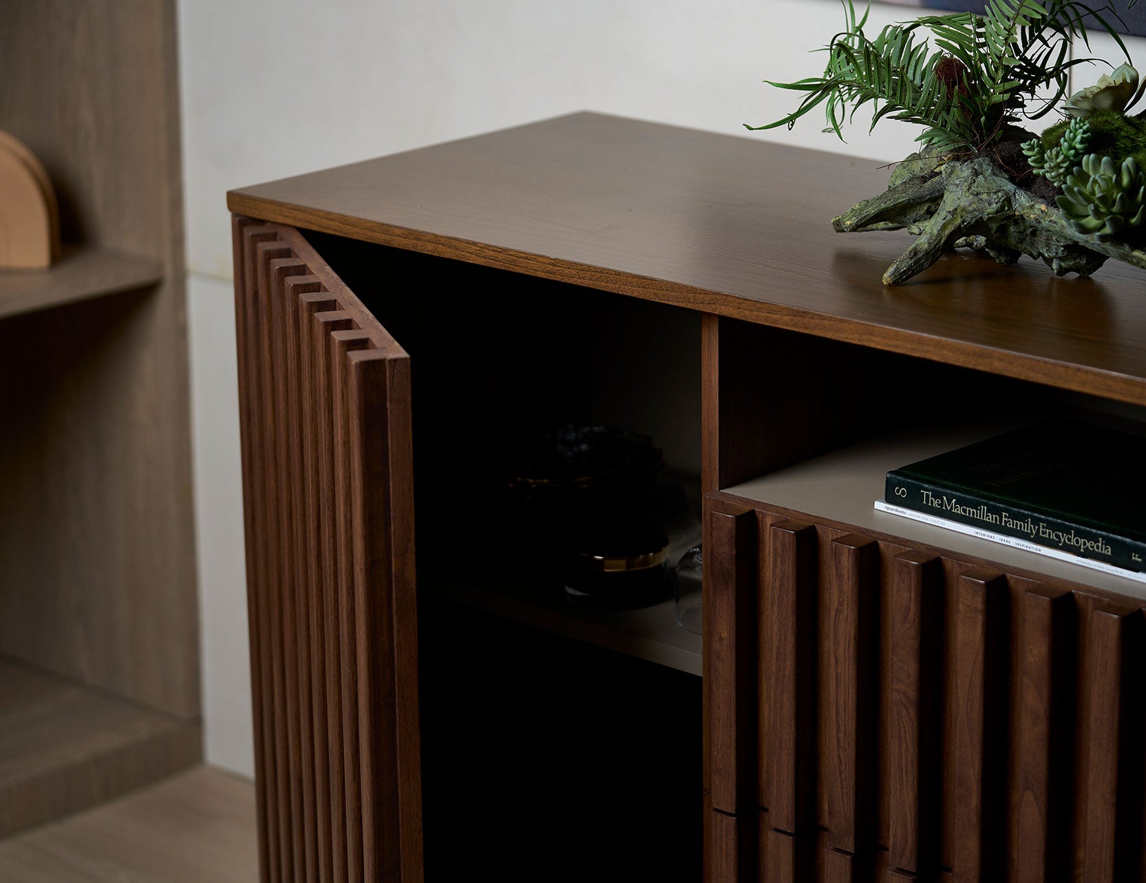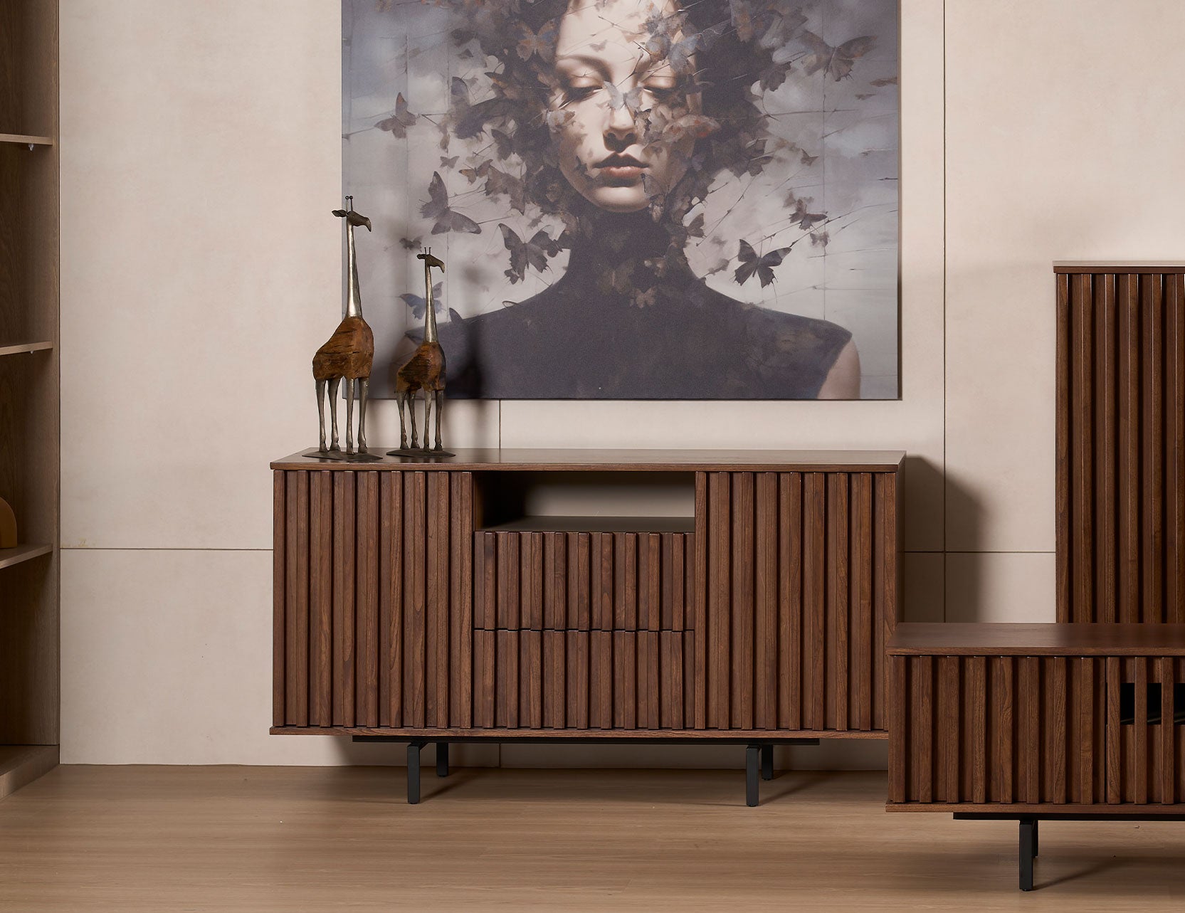 Besides the length of the storage furniture, consider your storage requirement and balance between functionality and aesthetics without overwhelming the space.